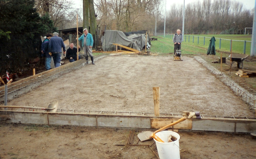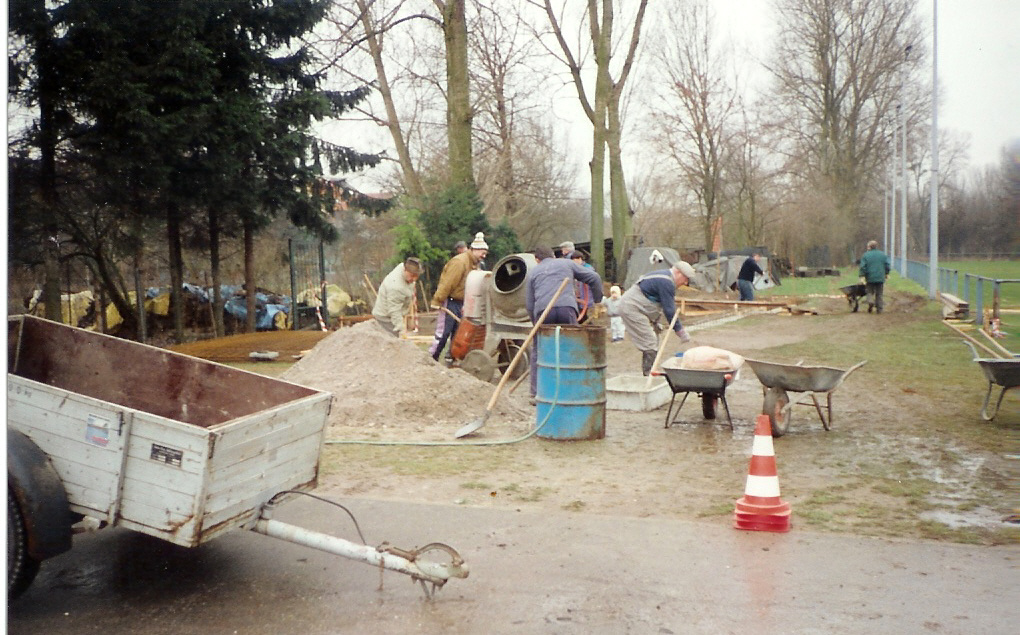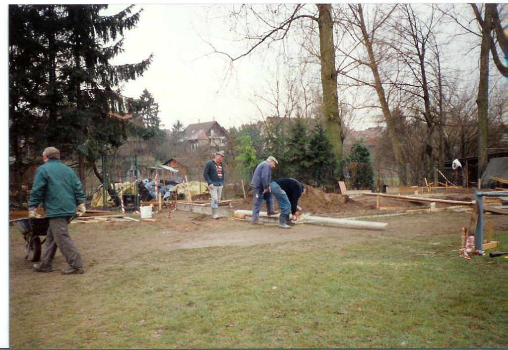 Ende Dezember 1993/Anfang Januar 1994 wurde das Fundament gegossen . Im Laufe des ganzen Jahres 1994 waren zahlreiche Helfer an Wochentagen und fast jedem Wochenende auf der Baustelle, schleppten Material herbei und setzten so Stein auf Stein. Im Herbst 1994 konnte dann das Dach, das als einziger Barackenteil noch brauchbar war, auf das erstellte Gebäude gesetzt werden. Außen- und Innenarbeiten gingen kontinuierlich weiter.